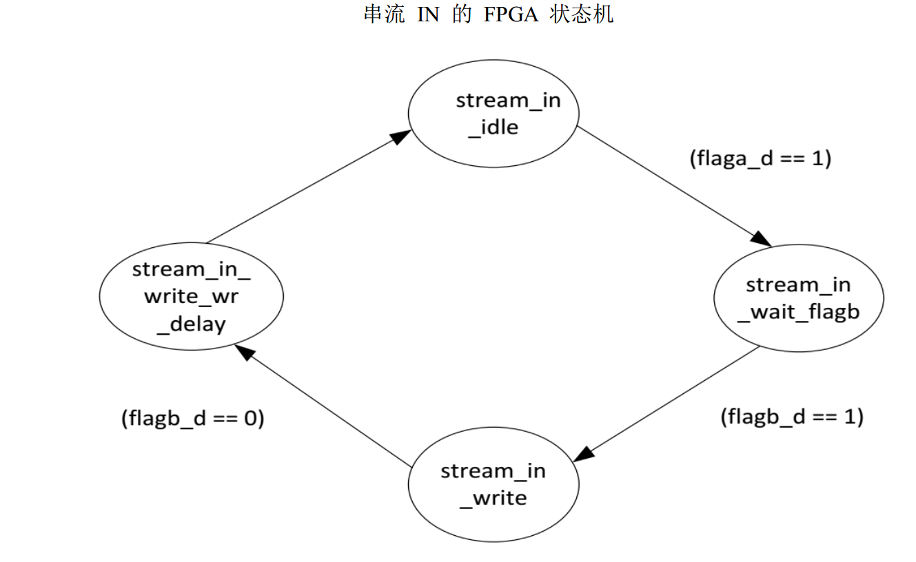 经过一个时钟周期后,状态机将进入stream_in_idle状态,根据使用局部标值情况下的通用公式,局部标志flagb变为0后,FX3需要对处于激活状态的SLWR#进行采样两个周期。由于考虑到FPGA至接口哦的一个周期的传输延迟,FPGA再对被置为0的flagb_d(flagb的出发输出)进行采样后激活SLWR#一个周期。